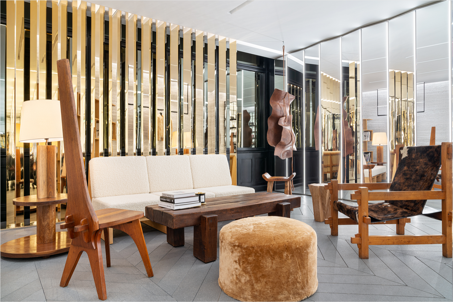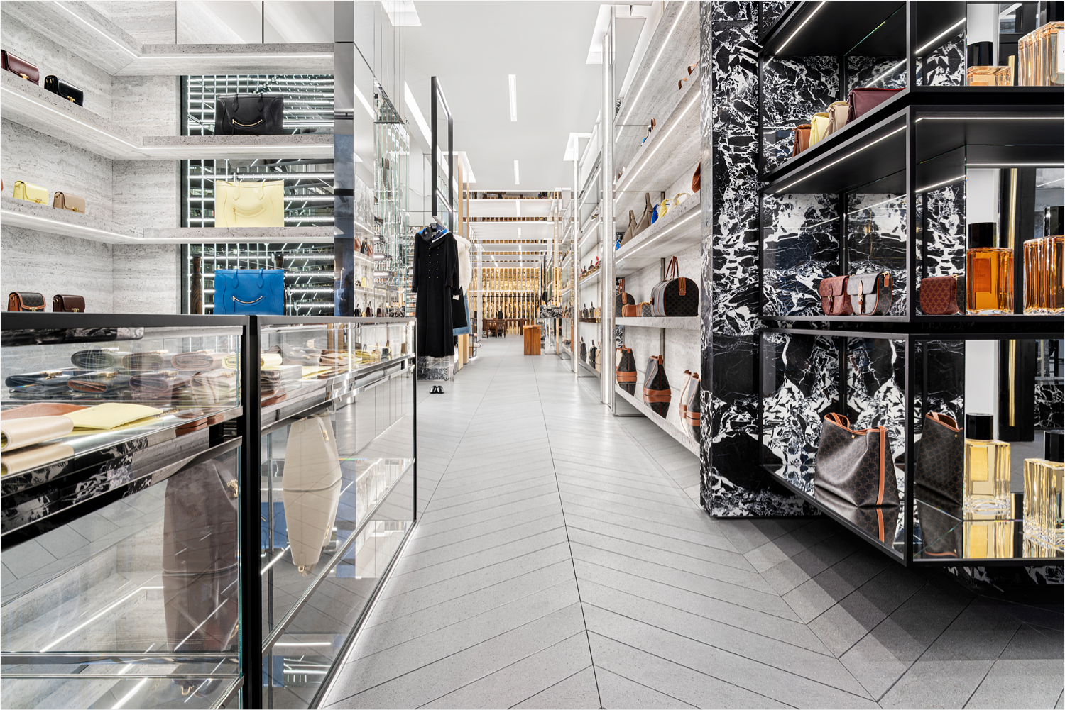 Der Store folgt einer klar definierten Raumlogik: Im Erdgeschoss entfaltet sich die feminine Welt von CELINE mit Lederwaren, Accessoires sowie der Haute Parfumerie- und Beauté-Kollektion. Eine freitragende Treppe führt in den ersten Stock, der – mit schwarzen Lackwänden und dunklen Hölzern – bewusst maskulin gehalten ist und die Menswear-Kollektionen beherbergt. In der zweiten Etage entsteht mit dem Salon und den erweiterten Umkleidebereichen eine private, fast wohnliche Atmosphäre, die perfekt ist für exklusive Beratungen. Und auch das CELINE Art Project, das weltweit künstlerische Positionen in die Stores integriert, findet hier seinen Ausdruck. Werke von Anders Hald, Jasmine Gregory, Rosalind Tallmadge und Marcelo Silveira setzen subtile Kontrapunkte zur Architektur und verweben Mode und Kunst zu einem ästhetischen Ganzen.