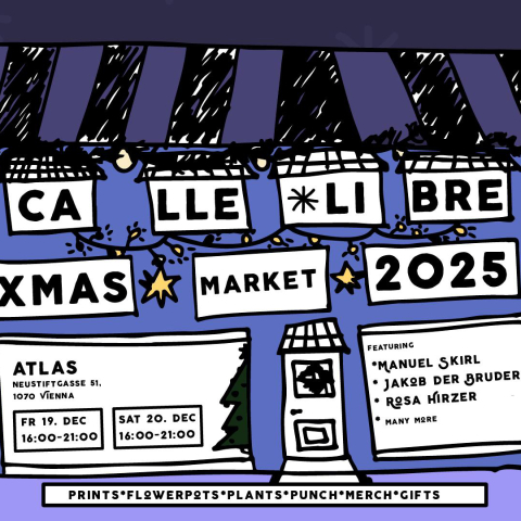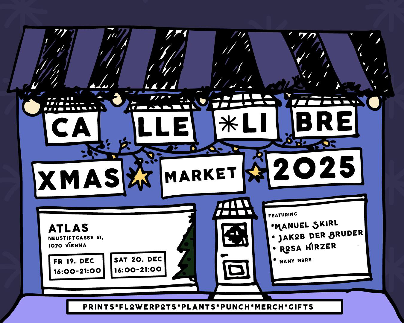 Der kuratierte Markt vereint zwei Tage lang Artworks, Prints und exklusiven Calle-Libre Merch von Künstlern wie Manuel Skirl, Rosa Hirzer, Jakob der Bruder, Pati Avish und noch einigen mehr aus dem Calle-Libre-Universum. Der Fokus liegt dabei auf individuellen Stücken mit Charakter – ideal für alle, die zu Weihnachten bewusst abseits von Massenware schenken möchten.