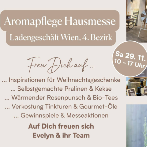 ••• Share on facebookShare on linkedinShare on twitter AROMAPFLEGE HAUSMESSE Events AROMAPFLEGE HAUSMESSE 29/11/2025 - 29/11/2025 10:00-17:00 Margaretenstraße 52, 1040 Wien