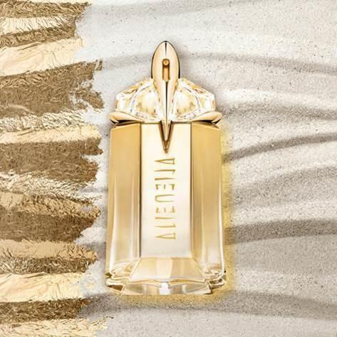Der ikonische Flakon von Mugler schmückt sich für Alien Goddess mit einem luxuriös golden schimmernden Kleid und schöpft seine übersinnliche Kräfte aus der symbolträchtigen Mondstein-Verschlusskapsel. Das Gewicht des Glaskörpers kontrastiert mit den grazilen Kurven des Flakons: Seine kraftvolle Ausstrahlung kommt erst richtig zur Geltung, wenn man ihn in selbst in der Hand hält. Wie der Mondstein wirkt dieser neue Talisman als Glücksbringer für Weiblichkeit und Fruchtbarkeit.